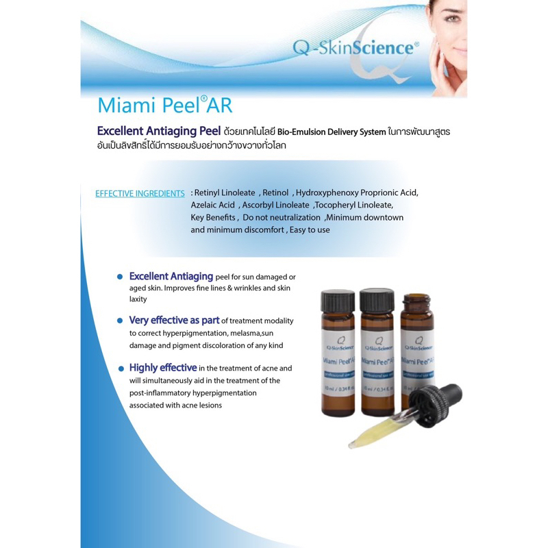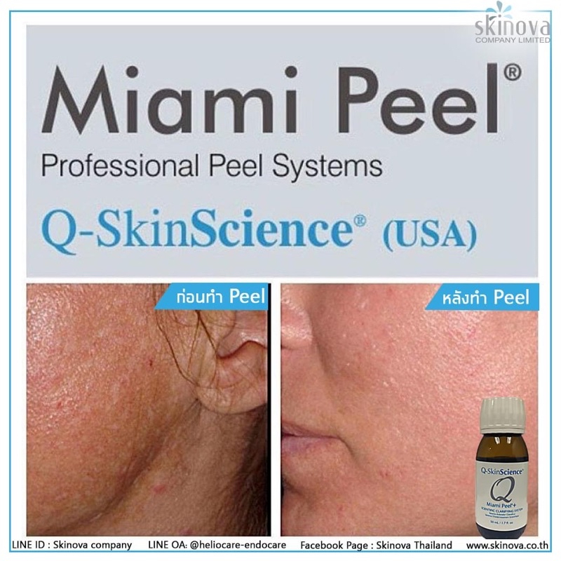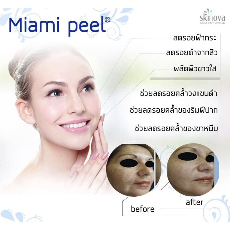 - Miami Peel ขวดชา ฝ้า กระ สามารถย้ำได้ Max สุด 5 ครั้ง แต่แนะนำ New case 2-3 ครั้ง ทิ้งช่วงห่างกันครั้งละ3 นาที ก็จะเห็นผิวหน้าเป็นสีชมพูแล้วค่ะ ทิ้งไว้ 5 นาที หลังจากนั้นไม่ต้องล้าง สามารถลงครีมบำรุง กันแดด ให้คนไข้ได้เลยค่ะ