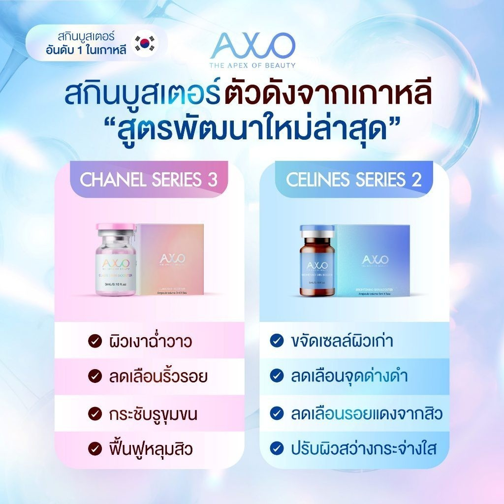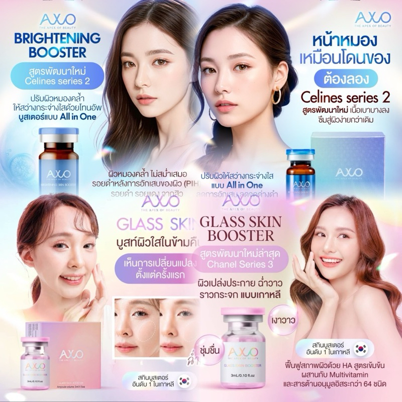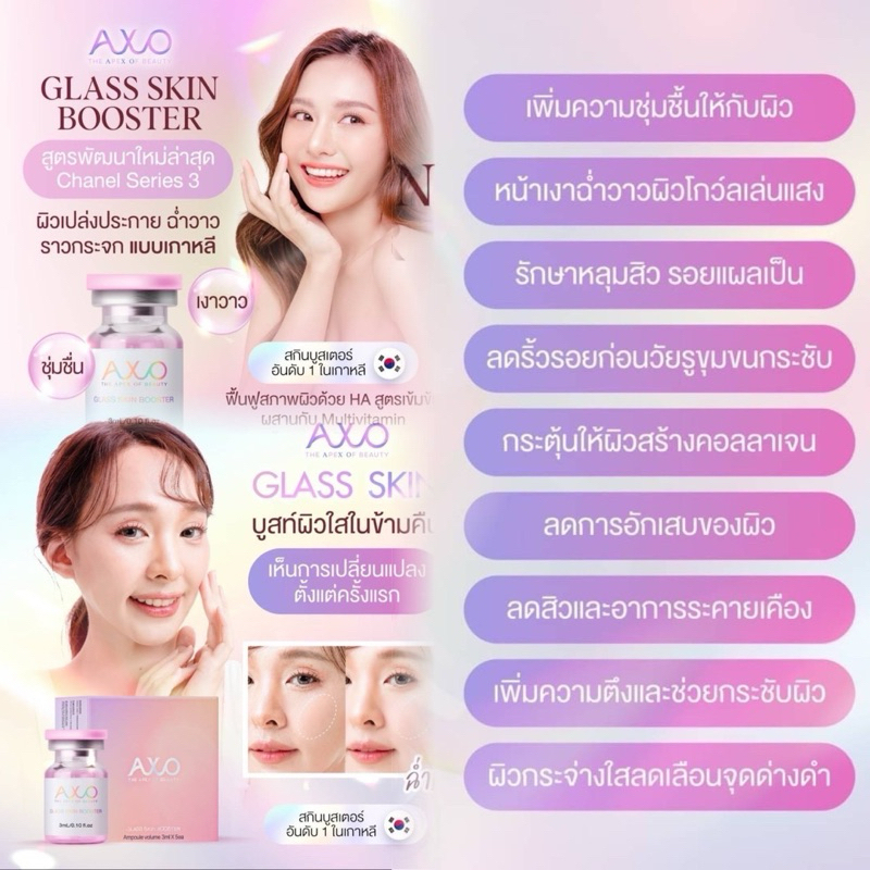 AXO GLASS SKIN BOOSTER แอ็กโซ กลาสสกิน บูสเตอร์ สูตรพัฒนาใหม่ล่าสุด Chanel Series 3 เติมความฉ่ำวาว เพิ่มความกระจ่างใส ยิ่งขึ้นกว่าเดิม เห็นผลอย่างรวดเร็ว ปลอดภัย มี อย. เกาหลี และอย ไทย